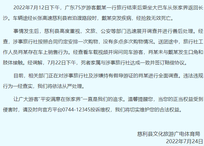 ·官方通报老人在旅行大巴上猝死:未发生口角及肢体接触,存在车上销售行为,涉事导游涉嫌持假证,正全面调查。