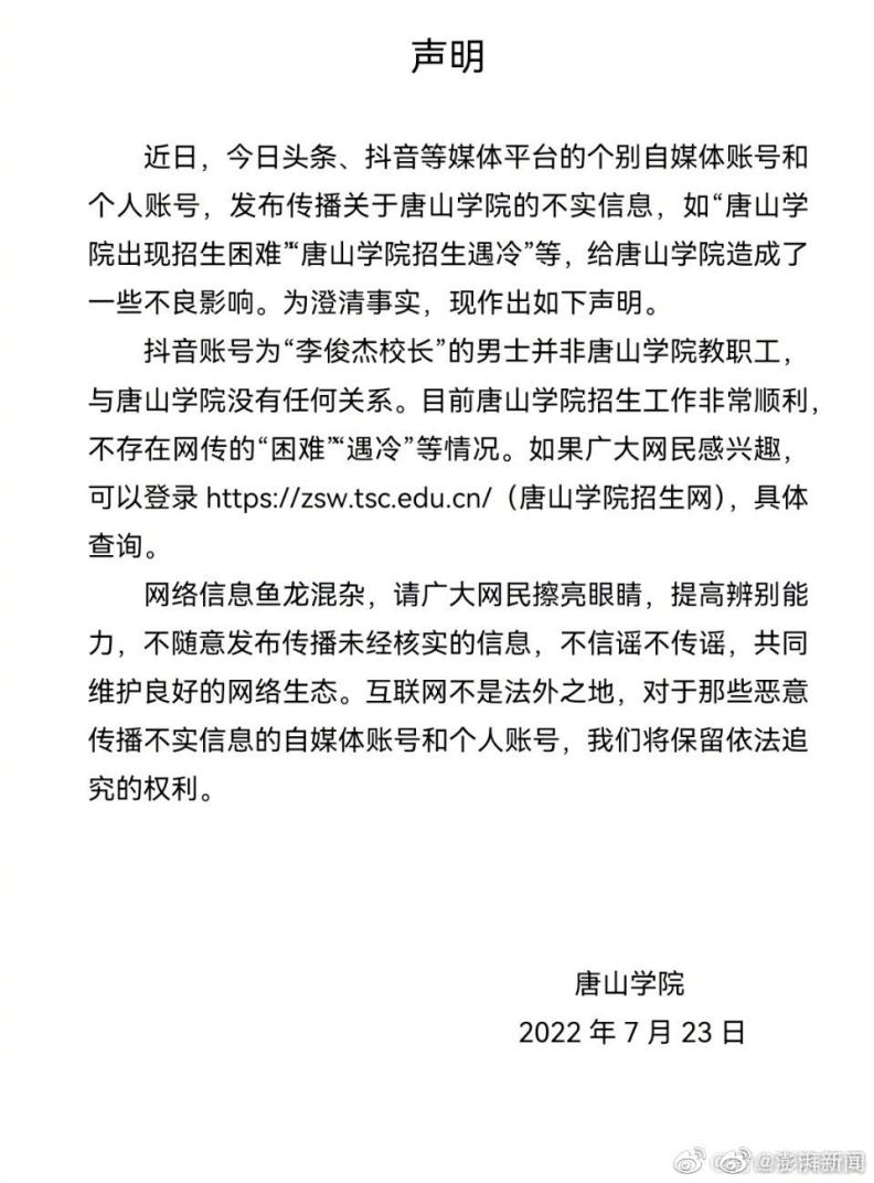 ·唐山学院发声明:不存在网传的“招生困难”“招生遇冷”情况。