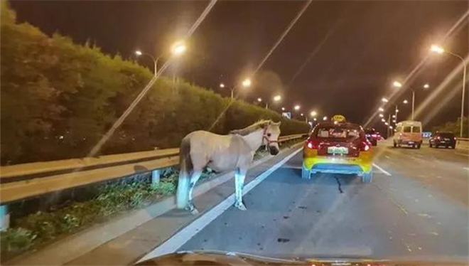 ·北京四环主路惊现奔跑的白马,北京交警:因货箱门未锁严,被马撞开。