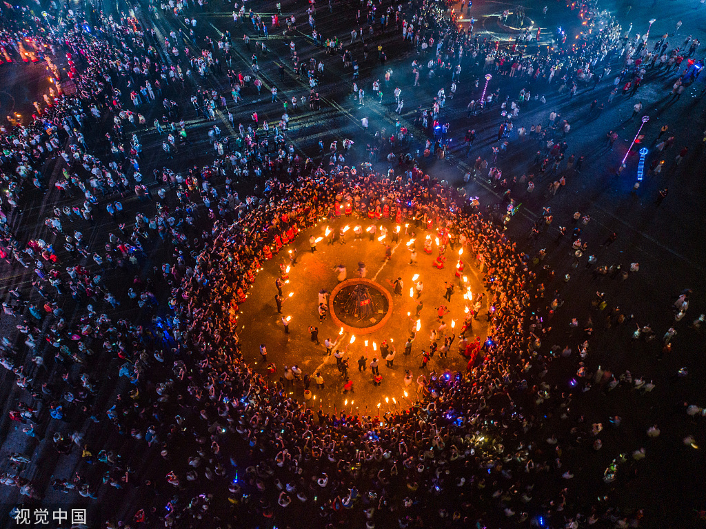 近日,贵州毕节,彝族同胞与游客在百里杜鹃管理区一起欢庆火把节。
