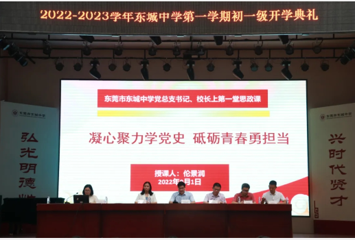 在东莞东城中学,党总支书记、校长伦景润以波澜壮阔的百年党史为主线,给全体初一年级的新同学上了一节题为《凝心聚力学党史 砥砺青春勇担当》的思政课。