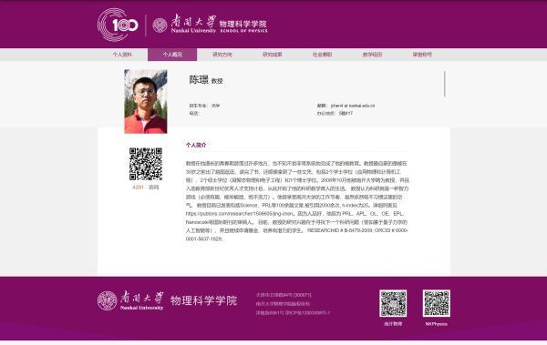 澎湃新闻记者9月17日查询发现,南开大学物理科学学院官网陈璟教授个人主页写道:“教授在他漫长的青春期游荡过许多地方,也不知不觉非常系统地完成了他的被教育。教授最自豪的是能在30岁之前出了趟国逛逛,读完了书,还顺便拿到了一些文凭,包括2个学士学位(应用物理和计算机工程)、2个硕士学位(凝聚态物理和电子工程)和1个博士学位。2008年10月他被南开大学聘为教授,并且入选教育部新世纪优秀人才支持计划,从此开始了他的科研教学育人的生活。”