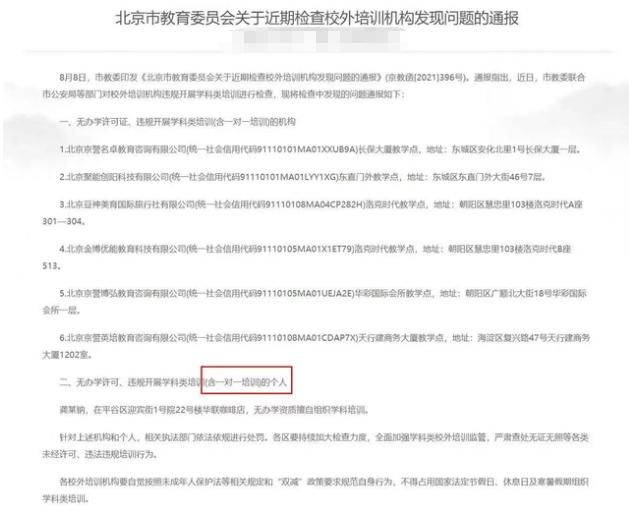 首先是任何组织和个人,不能以家教的名义,对中小学生进行学科补习,一旦发现就一定会严惩。其次是北京市教委也下发了相关的问题通报。在通报中针对一对一家教的情况作出了明确的规定。