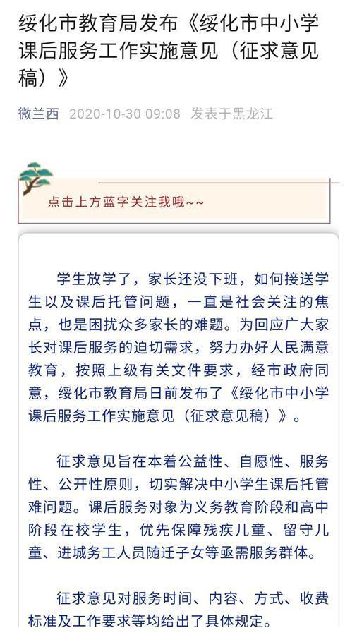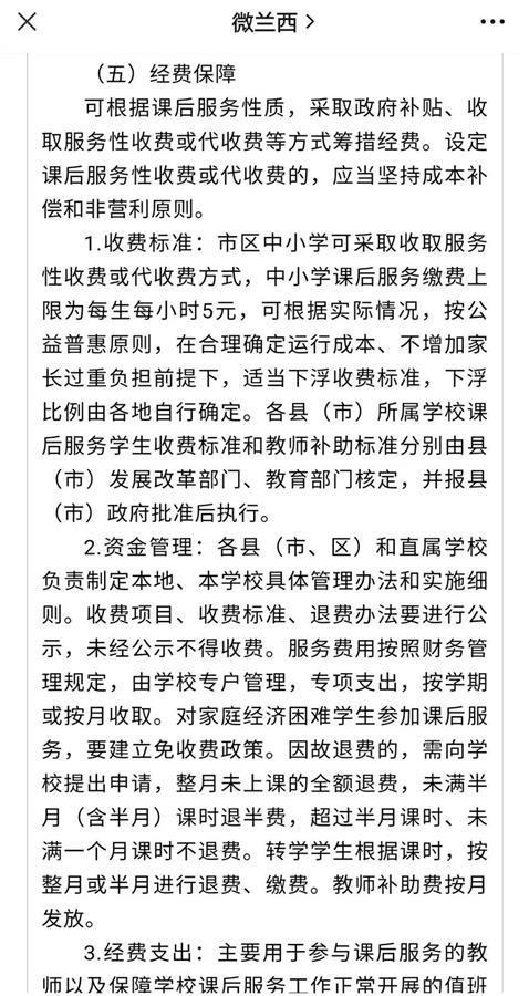 据绥化市教育局2020年10月底发布的《绥化市中小学课后服务工作实施意见(征求意见稿)》称,中小学课后服务缴费上限为每生每小时5元,可根据实际情况……适当下浮收费标准……经费支出主要用于参与课后服务的教师以及保障学校课后服务工作正常开展的值班领导、管理人员、服务人员的劳动报酬,要接受相关部门和学生家长监督。