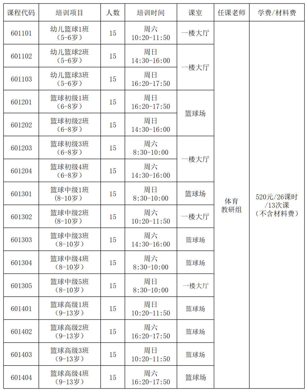 篮球初级班:学习篮球基本技术(原地、行进间)、传接球(原地、行进间)、防守脚步(行进间)和投篮。