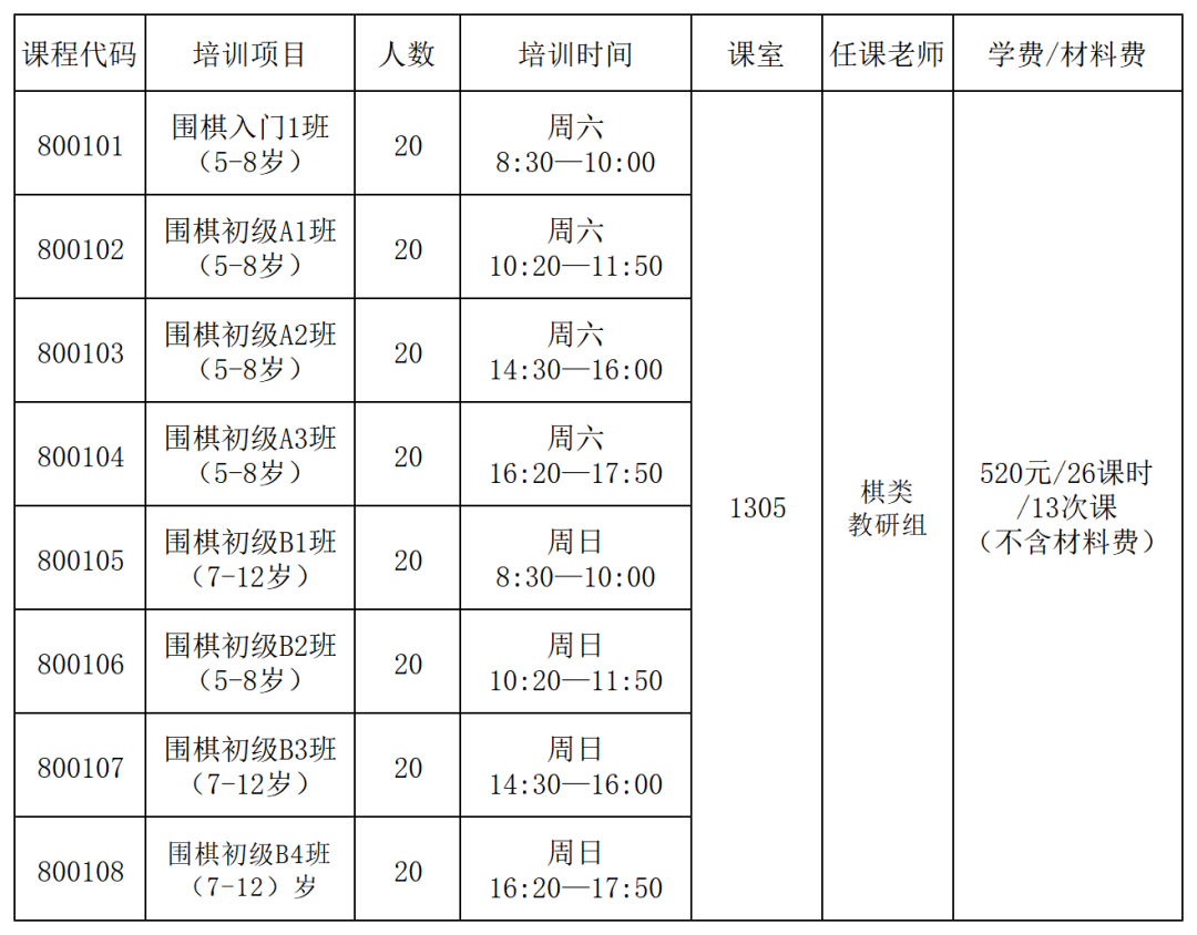 围棋初级班:学习布局基础、中盘基础、官子基础、各类手筋、实战死活和基本定式。(东莞市妇女儿童活动中心)