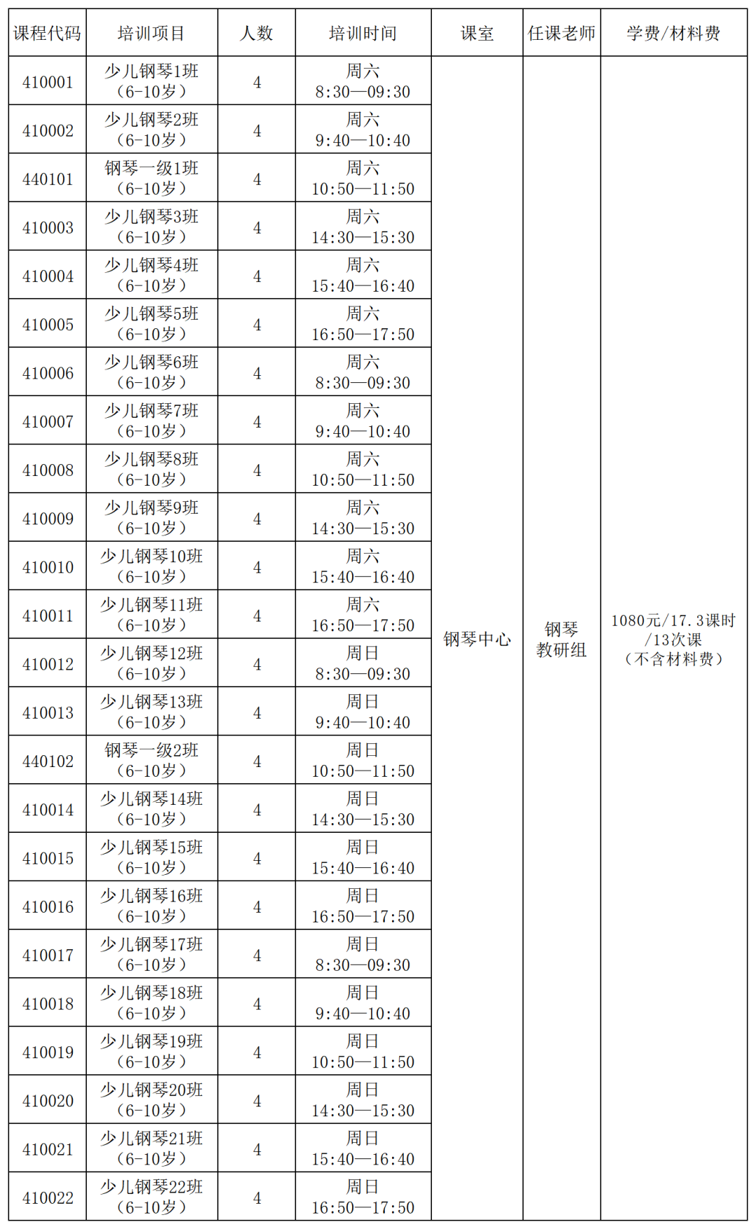课程内容:以小组课形式进行学习与训练,教学内容以学习钢琴基础为主,包含了坐姿、手型、识谱等,系统训练学生的演奏技巧,提升演奏能力。