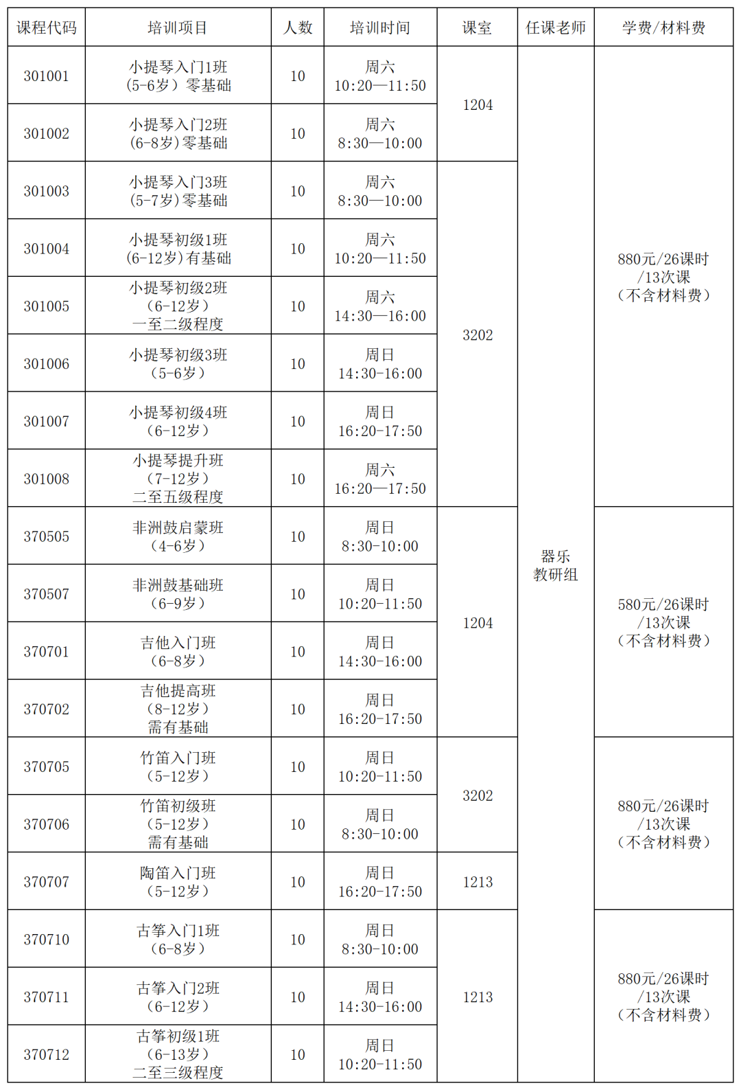 陶笛入门班:认识陶笛,学习持笛的姿势、手型和口型,气息训练和指法,学习7-10首小乐曲。