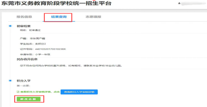 1.积分排名公示后,如个别申请人需对填报的志愿进行修改,可于2023年6月15日14:30—16日17:30前登录招生平台进行志愿修改(积分申请镇街不能修改)。逾期招生平台自动关闭,不能再修改志愿。志愿修改路径如图: