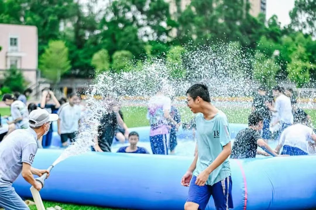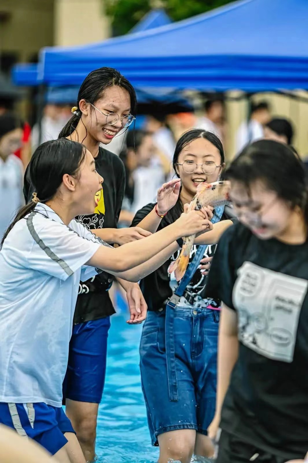初三学子们争先恐后,鱼贯而入,化身为捕鱼小能手,或一人“从天而降”,水花四溅,鱼儿不知踪迹;或两人一组,前后夹击,鱼儿束手就擒;或三五成群布下天罗地网,围追堵截,鱼儿无处遁形,手到擒来。望着手中的渔获和脸上的笑意,学子们的备考压力在一瞬间得到释放,水池化作一片欢乐的海洋。