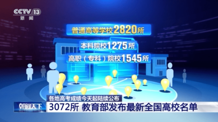 教育部也在近日发布了最新全国高校名单,截至今年6月15日,全国高等学校共计3072所,其中:普通高等学校2820所,含本科院校1275所、高职(专科)院校1545所;成人高等学校252所。