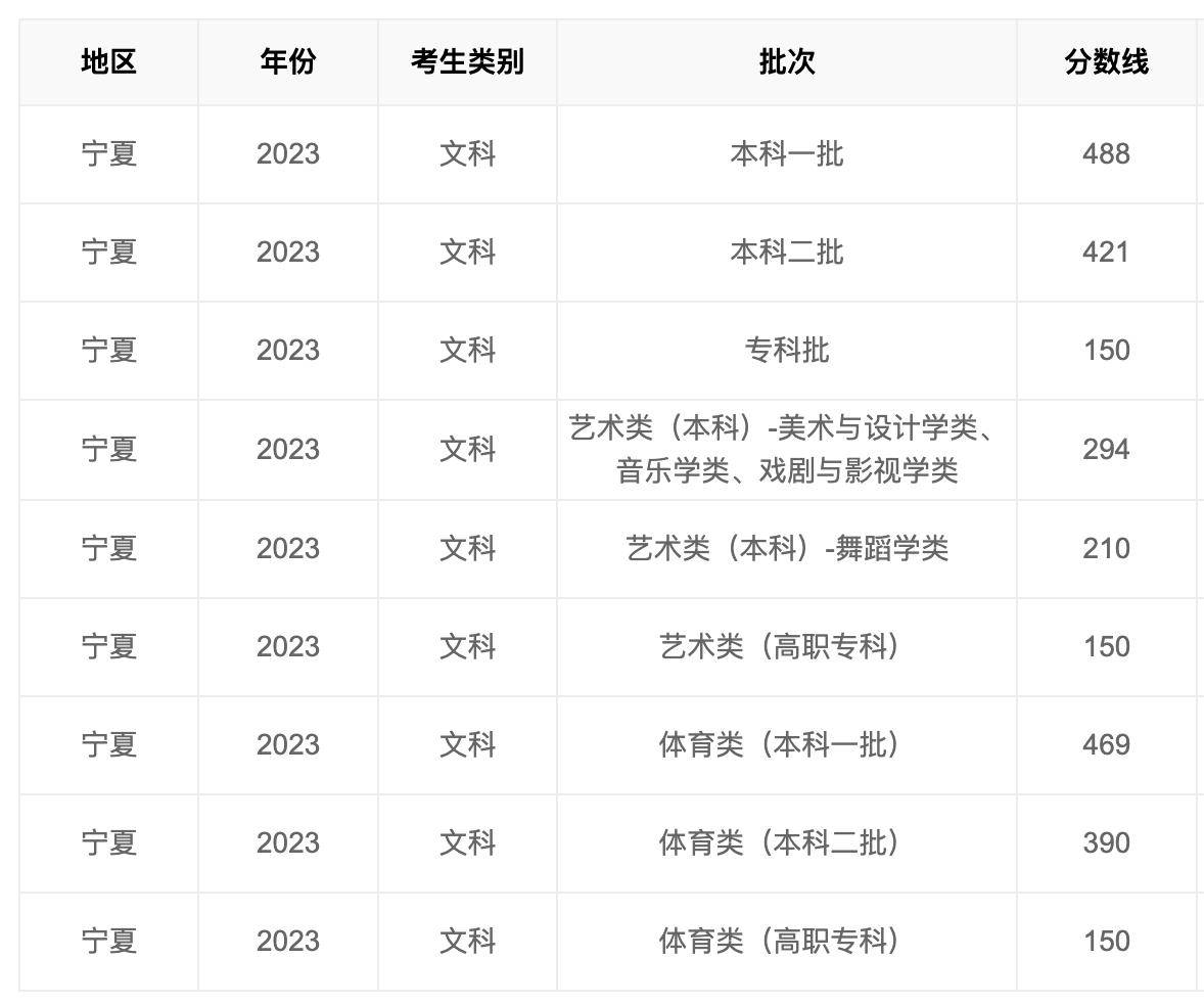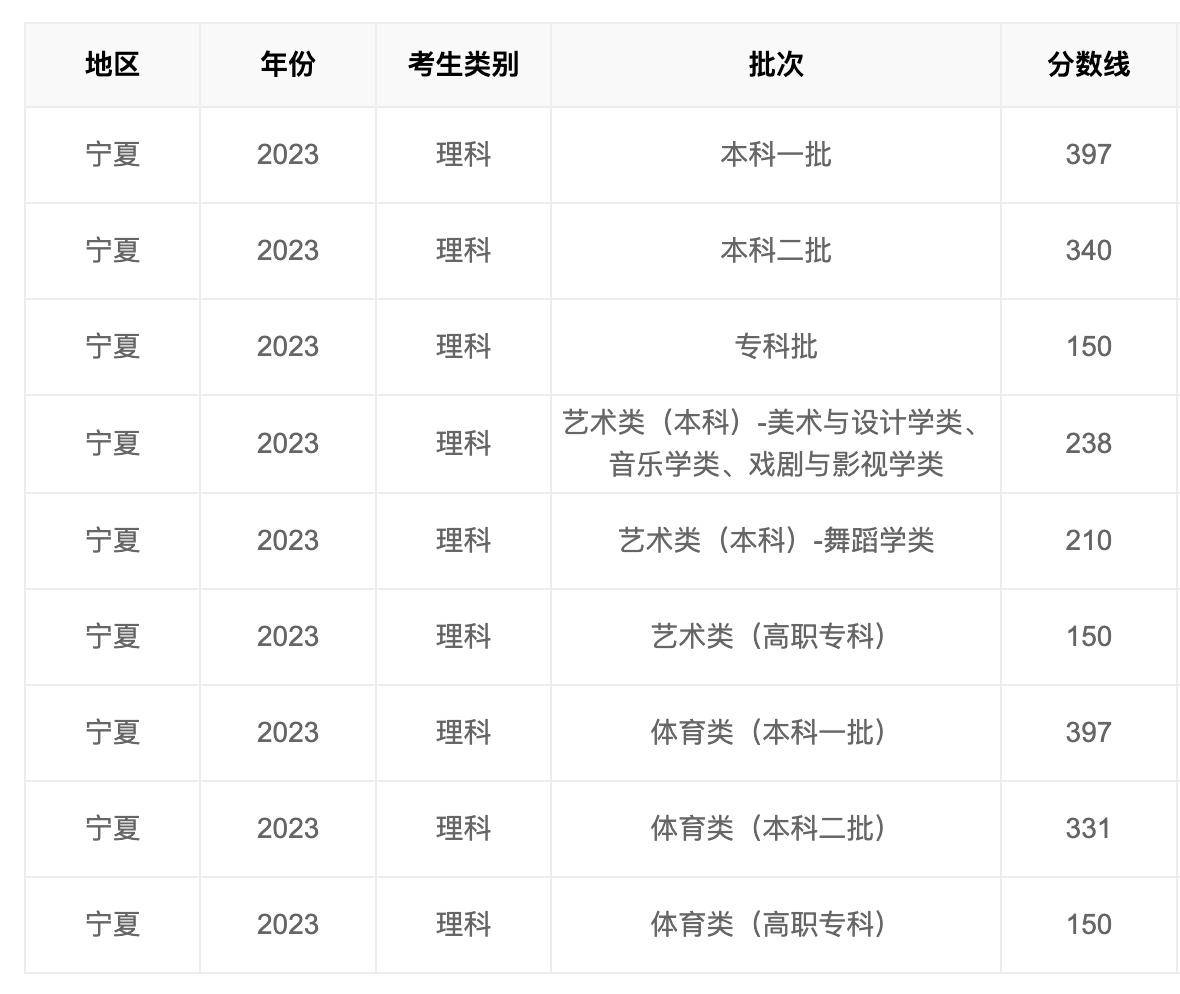 宁夏2023年高考录取分数线发布,理科一本线为397分,不到400分,二本线为340分,文科一本线为488分,二本线为421分,相比去年理科一本线下降15分,二本线下降10分,文科一本线变化不大,下降1分,二本线下降4分。