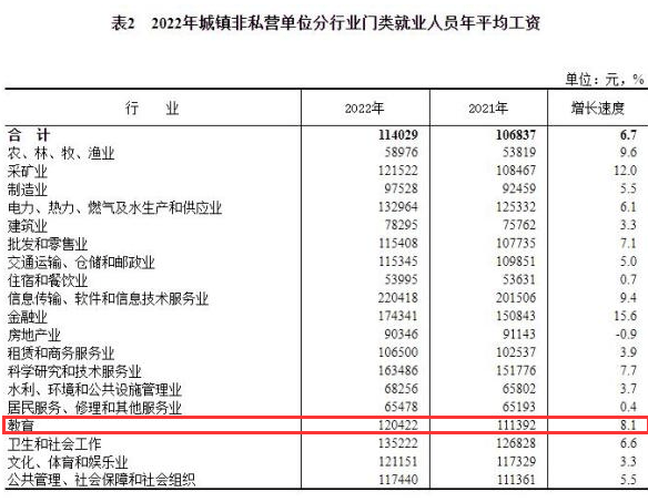 据国家统计局在5月9日发布2022年全国平均工资相关数据。2022年全国各行各业的平均工资为114029元,其中教育行业的年平均工资为120422元,相比于2021年,2022年增长了8.1%,总体呈上升趋势。