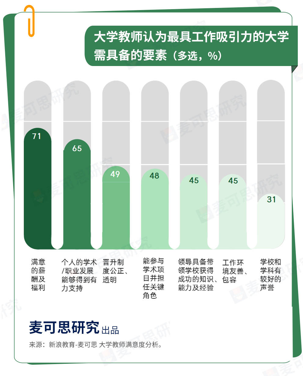 围绕高校教师薪资福利话题,麦可思2022年8月曾开展过一项教师满意度的研究。受访教师被问及最具工作吸引力的高校应具备哪些要素,满意的薪酬及福利是大学教师认为最重要因素,选择此项的比例为71%。其次是个人的学术/职业发展能够得到有力支持,为65%。