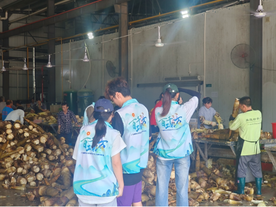 当地社工带领学生们来到竹笋加工企业育秀实业有限公司观摩竹笋罐头的生产加工流程,驻埔田镇帮扶工作队员还带他们走进当地竹笋加工企业——青源农业种养基地有限公司,并采访了青源农业种养基地有限公司运营总监林滨。通过采访,实践团了解到竹笋采摘过程中存在效率低、收益低等问题,并深刻意识到宣传推广对于竹笋销售的重要作用。基于此,实践团计划通过讲故事和设计文创产品等方式,有效提高竹笋产品的知名度,将埔田竹笋推广到珠三角、全国甚至全世界。