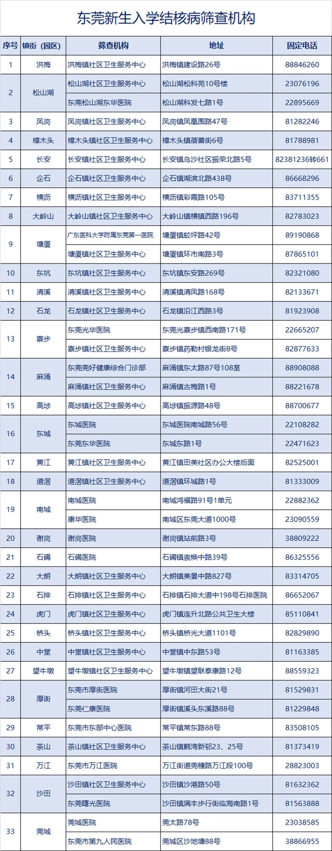 近日,市卫生健康局、市教育局日前联合印发《东莞市高中新生人学结核病筛查工作方案》,明确要求各镇街(园区)卫生健康行政部门、教育管理中心要根据新生入学肺结核筛查流程组织开展新生肺结核筛查工作,实现高中新生入学肺结核筛查全覆盖。