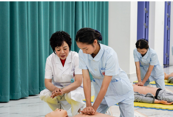 张先庚(左一)在护理实训室指导学生做急救操作。 李汶瑾 摄