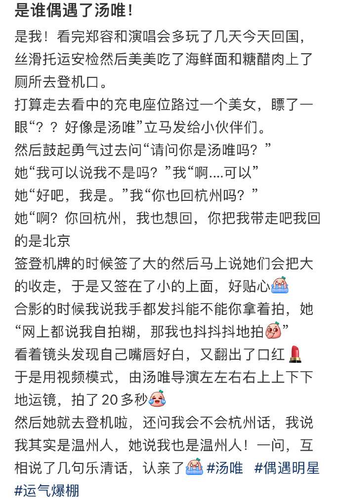 搜狐娱乐讯 近日,有网友在机场偶遇汤唯并且晒出合照签名。网友透露汤唯在拍照时,幽默回应了自己的自拍技术,她说“网上都说我自拍糊,那我也抖抖抖地拍”。另外,网友称两人还用乐清话交流了几句,汤唯本人非常nice。