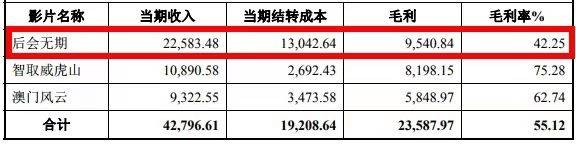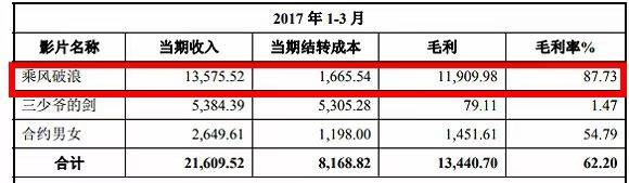 《乘风破浪》票房10.46亿元,投资方分账3.76亿元。博纳招股书披露,博纳为这部电影投入1666万元,带来收入1.36亿元,毛利1.19亿元,毛利率高达87.73%。