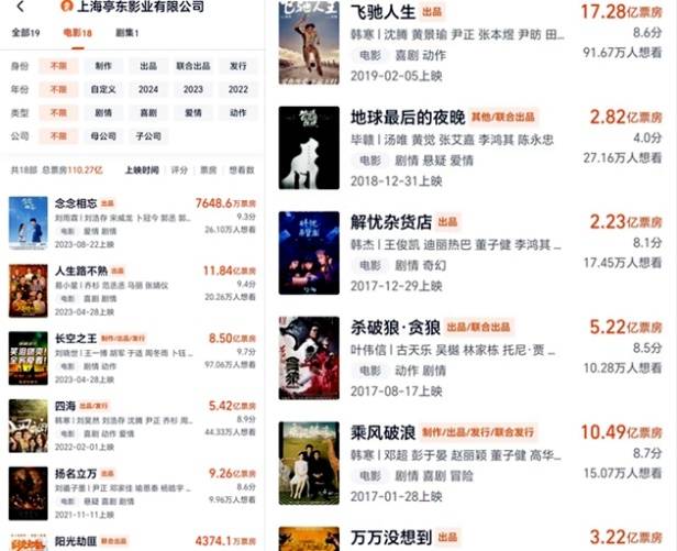 中等制作喜剧《人生路不熟》亭东影业是第一大主控出品方,该片票房11.84亿元,投资方分账4.32亿元。