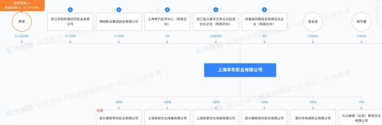 另外,持有亭东影业9%股份的第四大股东上海有竹投资中心(有限合伙)也是韩寒的公司,韩寒直接持有该公司70.575%股份。韩寒和其母亲周巧蓉100%实控的上海有云资产管理有限公司持有该公司10%股份。