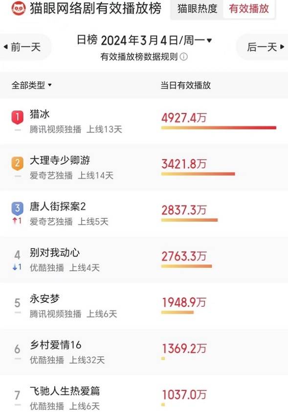 网剧《飞驰人生热爱篇》紧跟着电影的热映在2月28日播出,点播量进入同档期网剧前七。