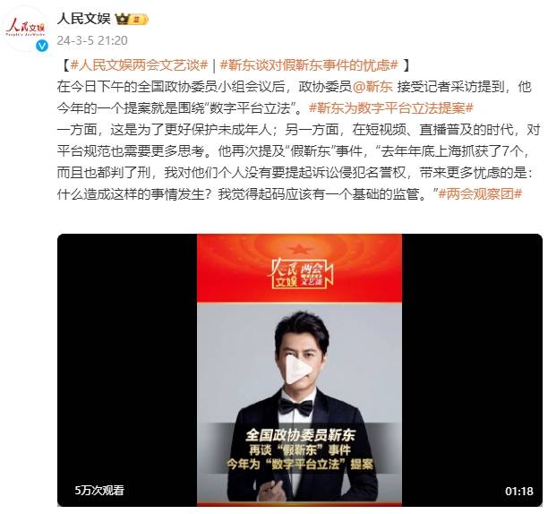 一方面,这是为了更好保护未成年人;另一方面,在短视频、直播普及的时代,对平台规范也需要更多思考。他再次提及“假靳东”事件,“去年年底上海抓获了7个,而且也都判了刑,我对他们个人没有要提起诉讼侵犯名誉权,带来更多忧虑的是:什么造成这样的事情发生?我觉得起码应该有一个基础的监管。