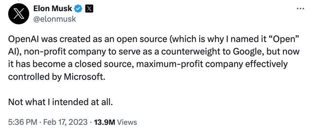 马斯克对OpenAI的这一决定,多次发出抨击,他曾在推特上吐槽:“OpenAI 最初是作为开源和非营利组织开始的。现在这两者都不是事实。”