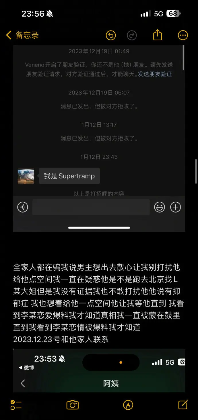7. 2024年初女生和男方恢复联系(但没说是不是复合),女生发现李金铭给男方发长文表白。