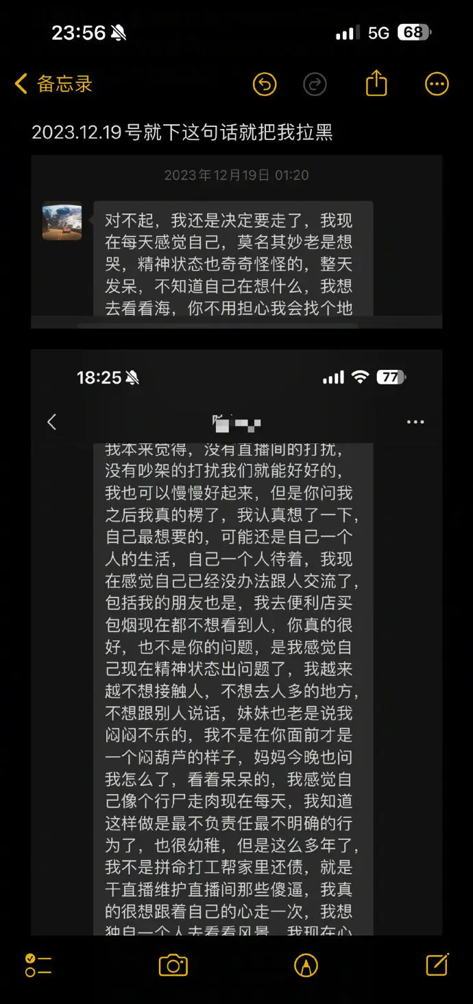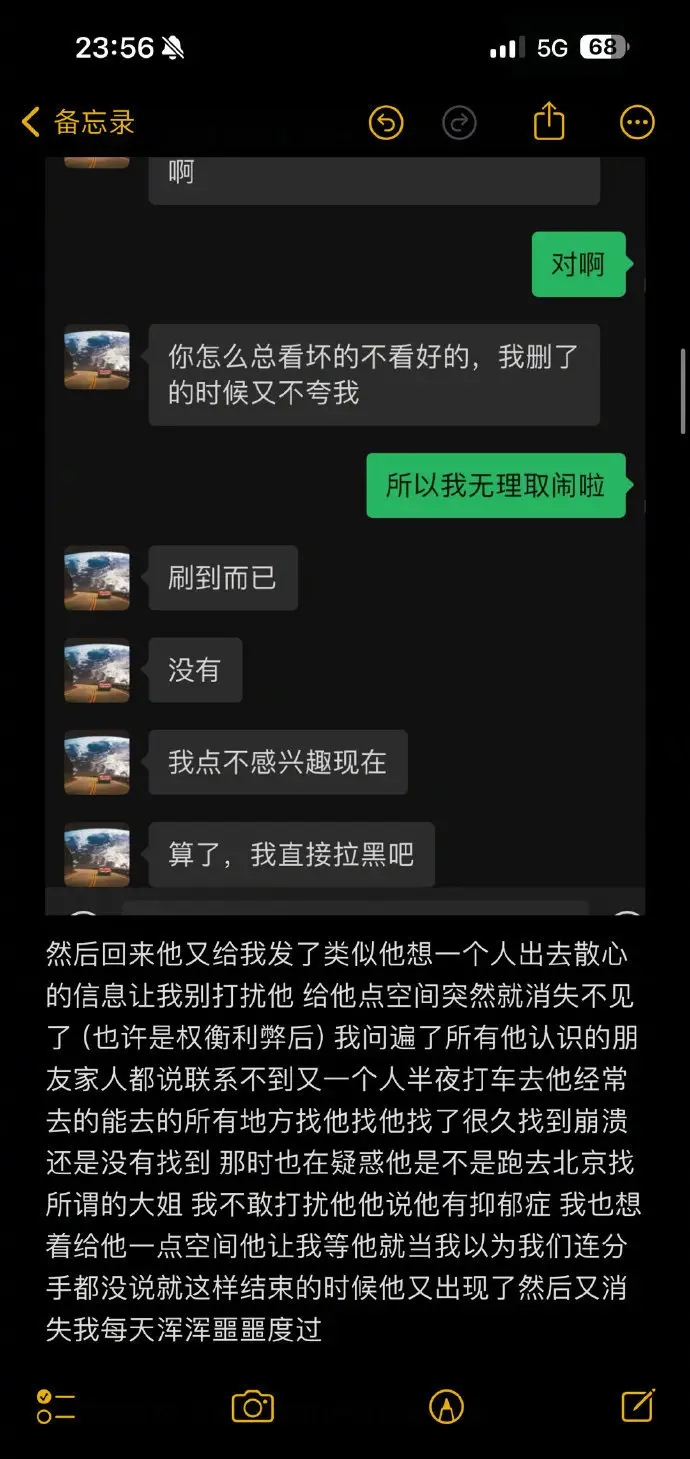 5. 2023年12月底,男方说自己抑郁症要和女生分手,并把女生拉黑,玩消失。