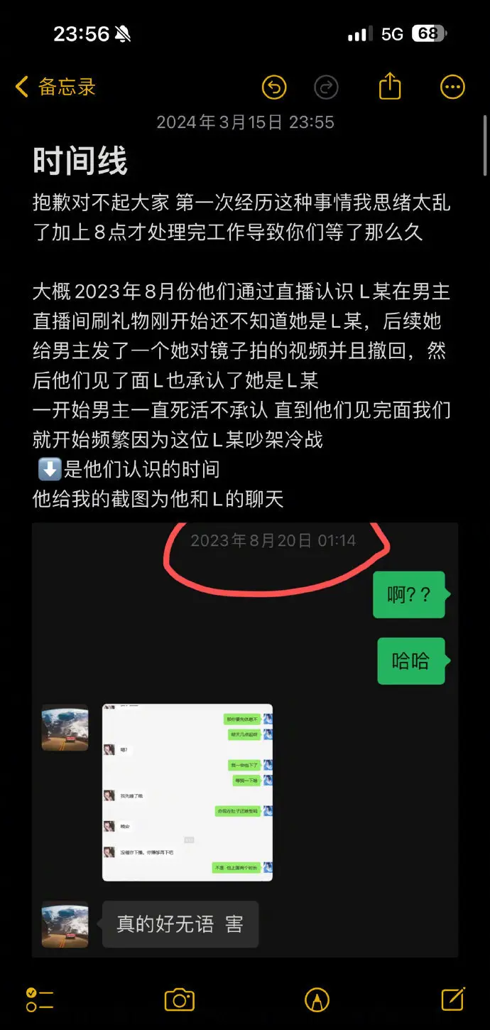 搜狐娱乐讯 近日,刘大锤曝光李金铭与素人男友恋情后,一位名为“用户6998687398”自称是男方女友的网友发文爆料,称自己被“绿”并晒出双方聊天记录,列出的时间线证据如下: