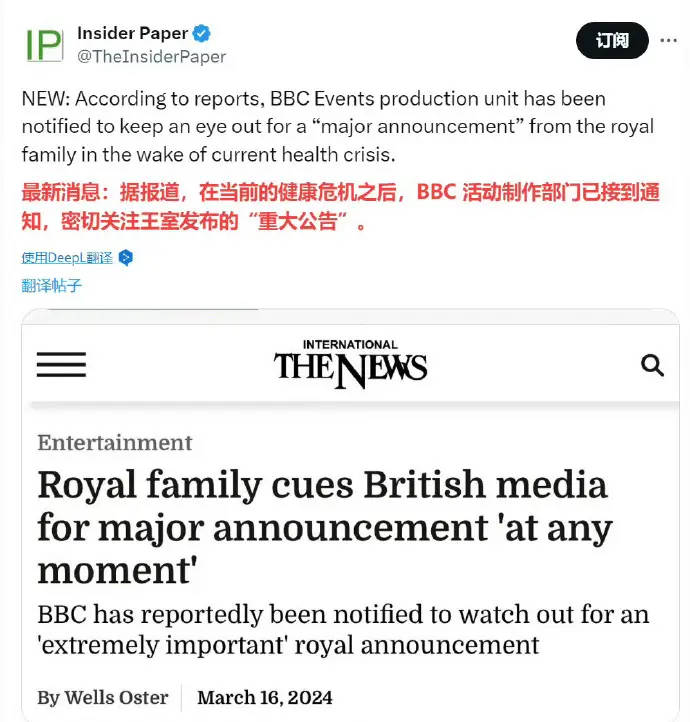 搜狐娱乐讯 3月17日,据外媒报道,BBC活动组织部门接到通知,王室将会在近期发布重大公告,要求BBC密切关注,不少网友揣测这则消息会与凯特王妃有关。