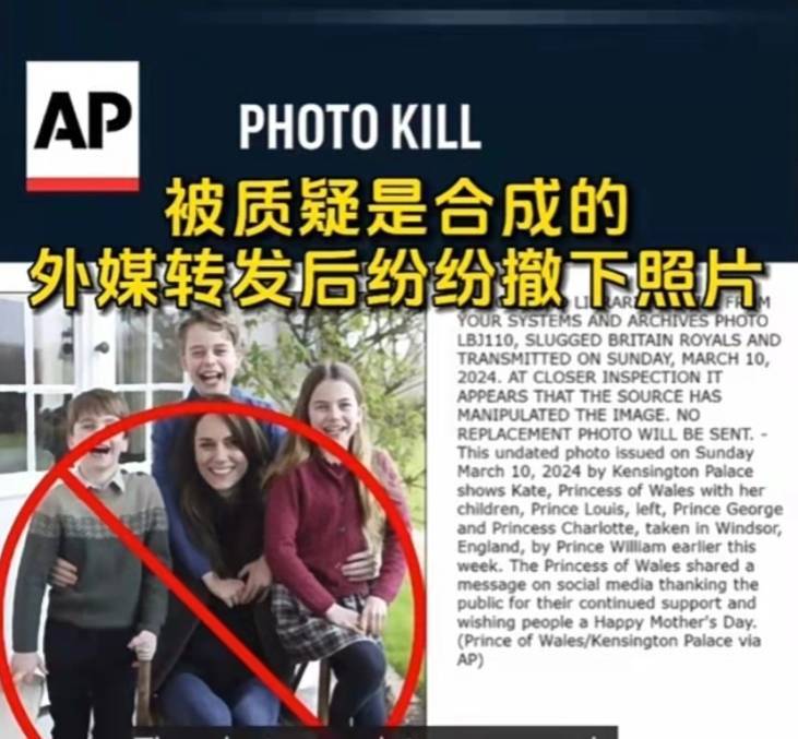 2024年3月10日, 凯特王妃官方账号发布母亲节合照,疑似向外界“报平安”。但随后有媒体质疑合照的合理性,指出扎啤存在多处P图痕迹。
