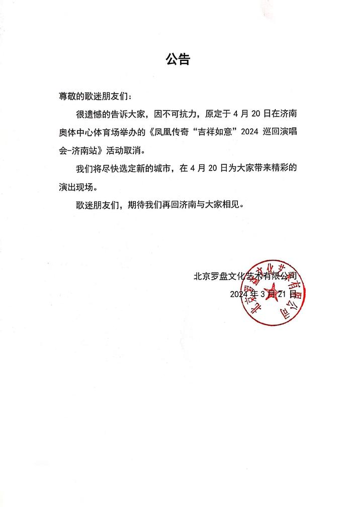 新京报讯 3月21日,罗盘文化官方微博发布公告:很遗憾的告诉大家,因不可抗力,原定于4月20日在济南奥体中心体育场举办的《凤凰传奇“吉祥如意”2024巡回演唱会-济南站》活动取消。我们将尽快选定新的城市,在4月20日为大家带来精彩的演出现场。据悉,罗盘文化为本次演唱会的主办方。