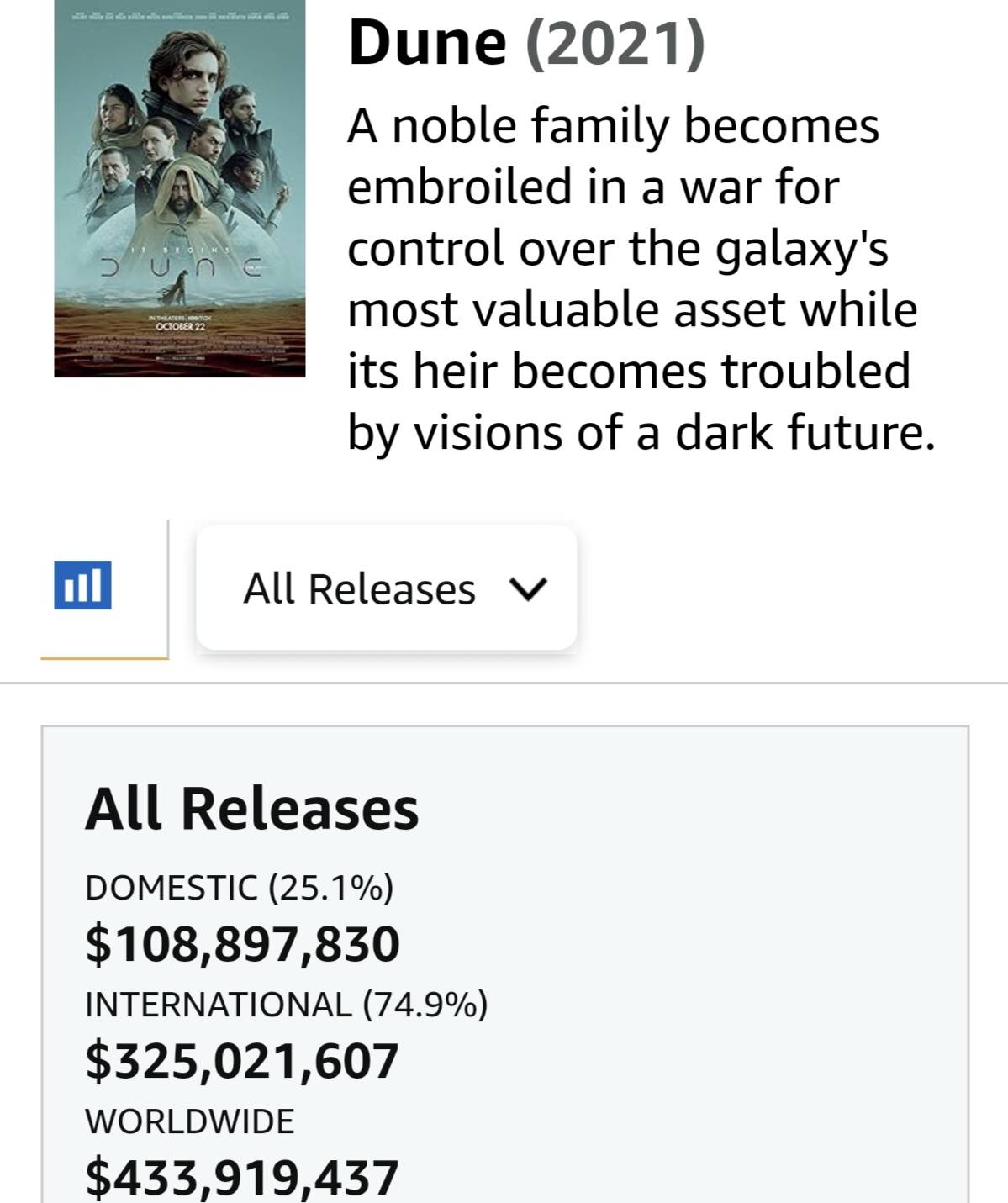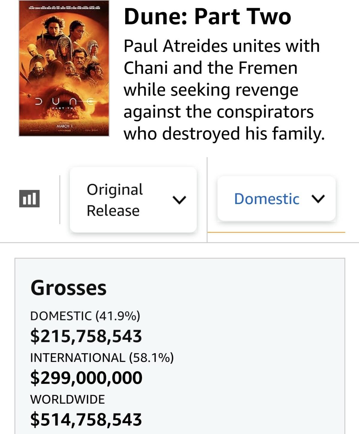 前作《沙丘》2021年上映,制作成本1.65亿美元,北美本土票房1.09亿美元,海外票房3.25亿美元,全球票房4.34亿美元,处在盈亏线边缘,没能赚大钱。