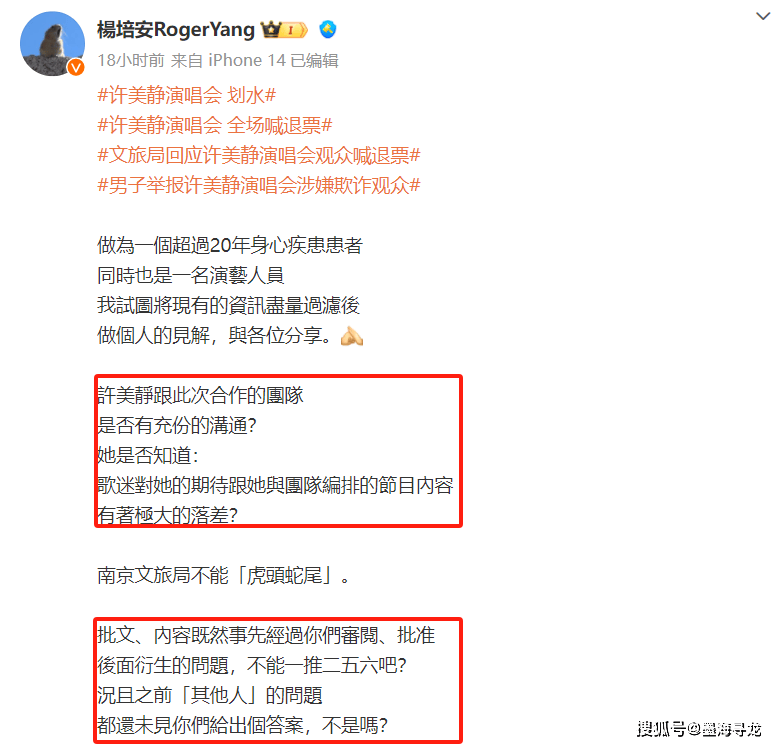不仅是观众对许美静有意见,这次连同行都看不下去了。4月21日,歌手杨培安就此事发声,一开始可能考虑到都是同行,所以措辞没有那么直接,只是委婉地提问许美静跟团队是否有充分沟通、是否知道节目内容跟歌迷的期待有极大的落差,并给南京文旅局施加压力,要求文旅不能虎头蛇尾,要对自己的项目批准负责。