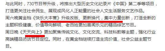 在品牌综艺升级方面,主要有《快乐大本营》和《天天向上》。《快乐大本营》升级改版、更新换代,集中力量创新,打造全新的主题积极健康、价值导向鲜明、老百姓更加喜闻乐见的精品综艺节目;而《天天向上》则更加聚焦传统文化、文化交流、科技科教等主题,强化行业高端精品访谈节目定位。