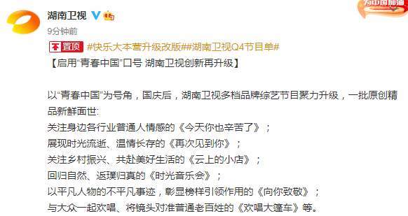 从湖南卫视的最新回应中可以看到,湖南卫视创新再升级,启用“青春中国”口号,多档品牌综艺节目聚力升级,还有一批原创精品新鲜面世:关注身边各行业普通人情感的《今天你也辛苦了》;展现时光流逝、温情长存的《再次见到你》等等。