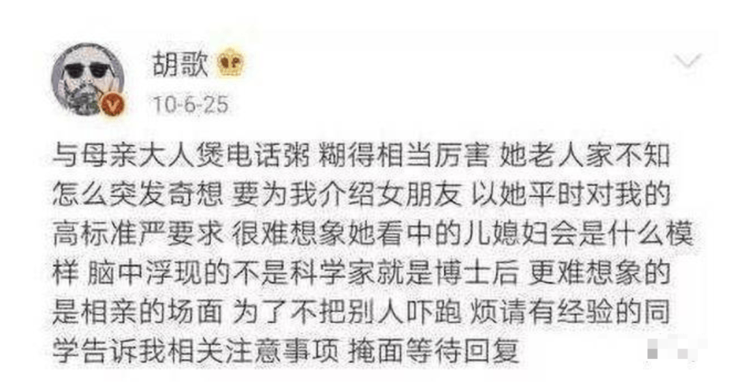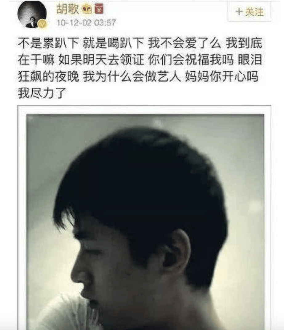2010年胡歌有次醉酒后发文不满妈妈太干涉自己的感情,称自己不会再爱了,还喊话妈妈称:“如果明天去领证,你们会祝福我吗,眼泪狂飙的夜晚,我为什么会做艺人,妈妈你开心吗,我尽力了”。看得出胡歌的疲惫,以及对妈妈的无奈态度,不过这条微博发出没多久,酒醒后的胡歌便将这条微博删除。