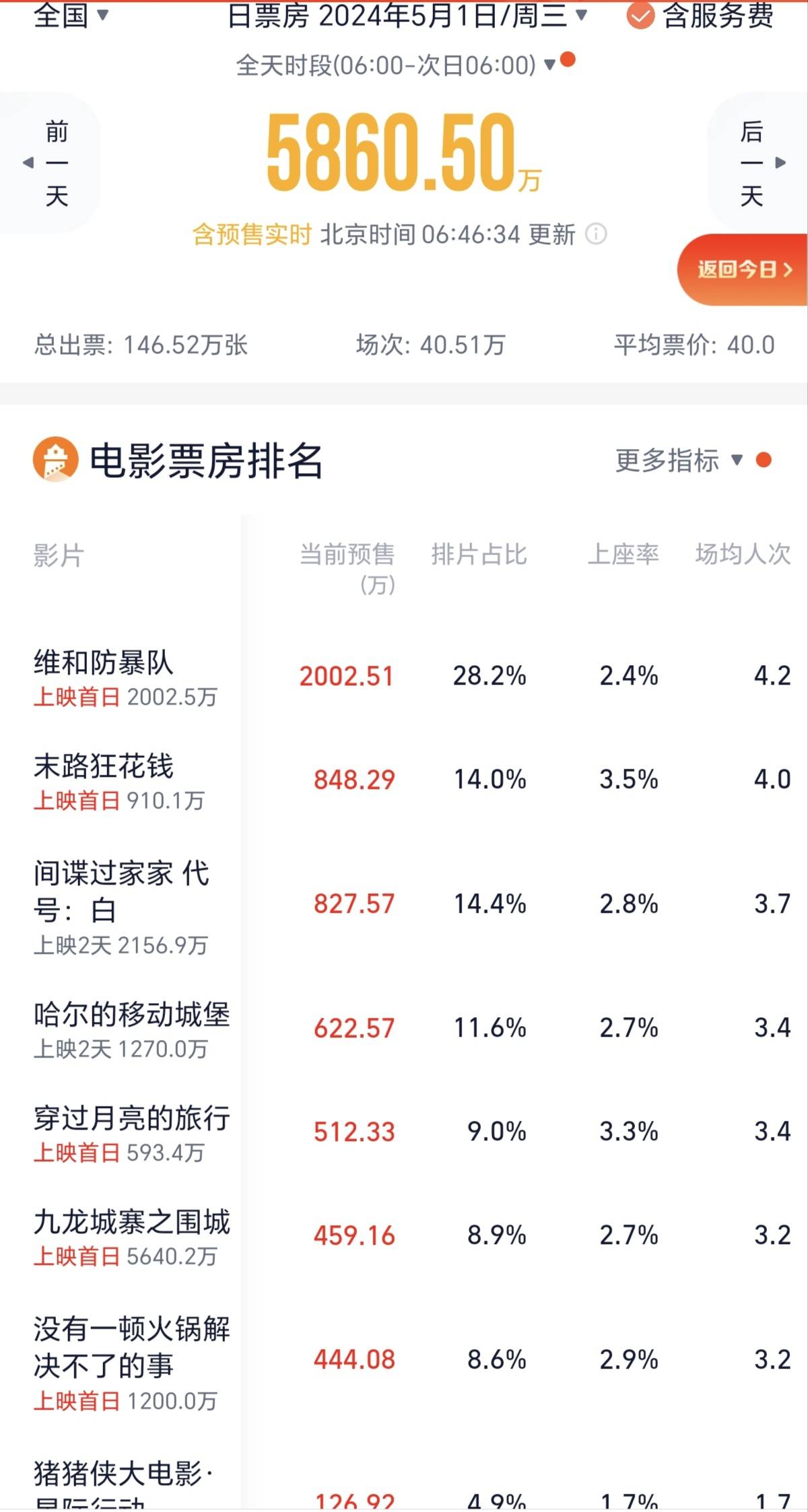 5月1日预售票房排第一的是黄景瑜、王一博等主演的《维和防暴队》,首日预售突破了2000万元,占大盘票房的34%。预排片占比28.2%,遥遥领先。