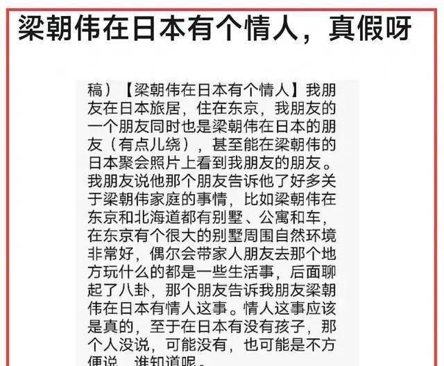 有消息传出,刘嘉玲紧急出售豪宅的主要原因是因为梁朝伟在日本有个情人,梁朝伟在东京、北海道都有别墅、公寓和车,甚至还有一个秘密情人。至于梁朝伟与情人有没有孩子,该朋友表示不确定。