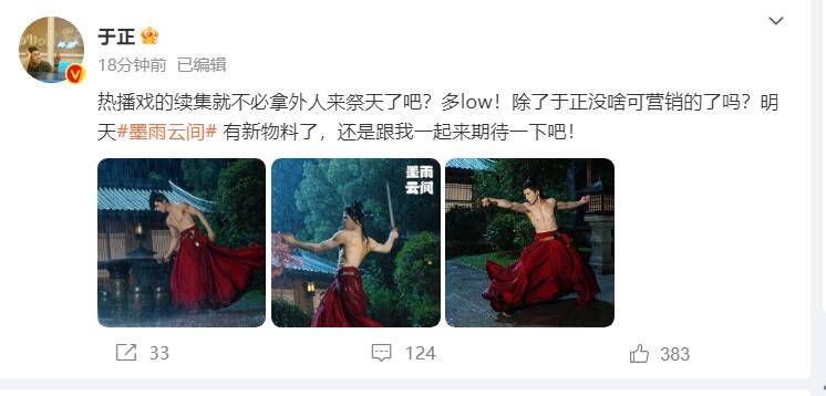 搜狐娱乐讯 5月16日,于正发文回应当年差点拍《庆余年》,他写道:“热播戏的续集就不必拿外人来祭天了吧?多low!除了于正没啥可营销的了吗?” 并晒出了三张自家艺人的照片宣传电视剧。