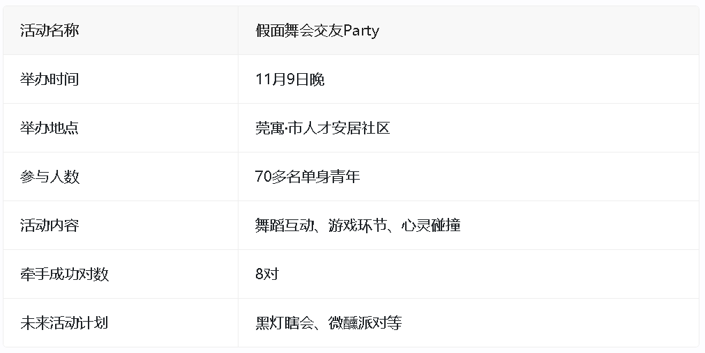 11月9日晚,莞寓第五届青年交友活动“假面舞会交友Party”圆满结束。70多名来自东莞各企事业单位的优秀单身青年参加了此次活动,通过舞蹈和游戏环节寻找浪漫邂逅。当晚,共有8对青年成功牵手。此外,莞寓还计划举办更多元化的交友活动,以服务更多单身青年。