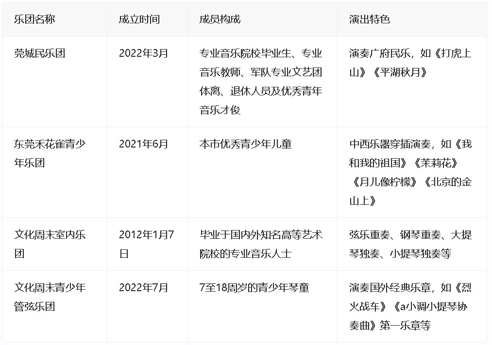 - 莞城民乐团:成立于2022年3月,由专业音乐院校毕业生、专业音乐教师、军队专业文艺团体离、退休人员及优秀青年音乐才俊组成。