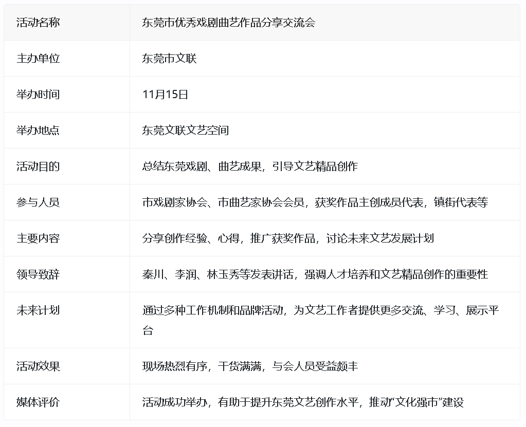 通过本次分享交流会,东莞市文联不仅展示了其在推动文艺事业发展方面的决心和能力,也为未来的文艺创作指明了方向,奠定了坚实的基础。