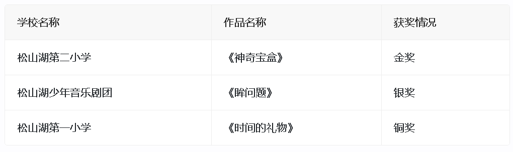 以下是松山湖各小学在东莞少年音乐剧大赛中的获奖情况: