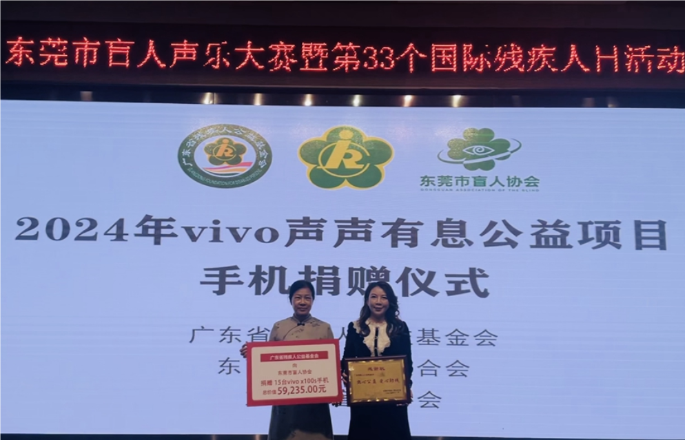 在随后的颁奖仪式上,广东省残疾人公益基金会向东莞市视障听障学生捐赠了15台VIVO手机,市残联教就部部长陈惠英作为代表接受了捐赠,并回赠感谢牌匾。市盲人协会主席何月贤代表盲人群体向东莞图书馆等单位和群体赠送牌匾,以表达对他们的支持和帮助的感谢。