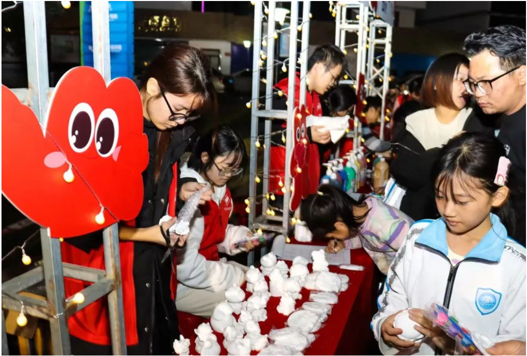 在手工体验区,市民们可以沉浸式体验各种DIY活动,如花草宫灯制作、马赛克杯垫制作、手指拇指琴DIY和石膏娃娃涂鸦等。这些活动不仅吸引了众多市民的参与,还联动园区各机构提供了硬笔书法风车制作、手串DIY等课程体验。在动手制作的过程中,大家收获了创作的幸福与满足。活动现场还设置了“幸福北部”心意市集,展示志愿者们的手工作品,并招募新成员,进一步扩大了“巧手心传 筑梦北部”青年手工志愿服务队的影响力,让更多人感受到志愿服务带来的温暖与力量。现场还开展了寻宝游戏,居民群众通过寻找散落在产业园各角落的锦囊,兑换惊喜小礼品,感受“寻宝”的乐趣与惊喜。“北部有Young”青年集市则提供了各类小吃、饮品以及文创产品,让市民在品尝美食、购买文创产品的同时,享受悠闲的夜生活。