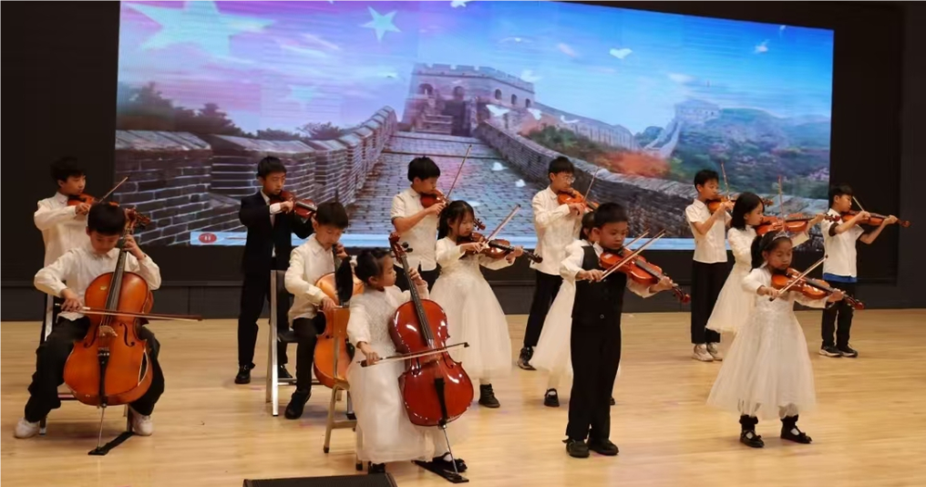 报告厅内,在主持人杨星语和郭志腾热情洋溢、充满活力的开场致辞中,一场艺术盛典正式拉开帷幕。民族乐团率先登场,奏响《龙的传人》与《旱天雷》,激昂旋律回荡校园,展现了当代小学生的精神风貌与对民族文化的热爱,赢得热烈掌声。接着,学校重点打造的管乐团带来《红星闪闪》,精湛演绎让观众仿佛回到热血年代。随后,中国舞《成长在祖国的怀抱里》登场,小舞者们身姿轻盈、笑容灿烂,用饱含热爱与憧憬的动作传递成长的喜悦。魔术《彩色世界》以神奇手法引发观众阵阵惊呼,将奇幻艺术魅力尽显。爵士舞班活力演绎《表白》和《卡路里》,尤克里里奏响独特的《十个印第安人》,街舞团队的《动感小舞王》凭借炫酷动作与高超技巧将气氛推向高潮,让校园充满动感活力。武术表演《中华武术》刚健有力,一招一式彰显中华武术魅力与文化自信,备受赞誉。舞台上的孩子们光芒四射,台下的家长们掌声雷动,为孩子们的精彩表现喝彩。最后,弦乐团的弦乐合奏《国家》缓缓奏响。悠扬的旋律饱含着当代少年的深沉爱国情怀,如同一股温暖而强大的力量,在校园中悠悠回荡,为本次文艺展演画上了圆满而动人的句号。