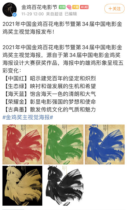 2021年中国金鸡百花电影节暨第34届中国电影金鸡奖主视觉海报,源自于第34届中国电影金鸡奖海报设计大赛获奖作品,海报中的雄鸡形象呈现五彩变化: